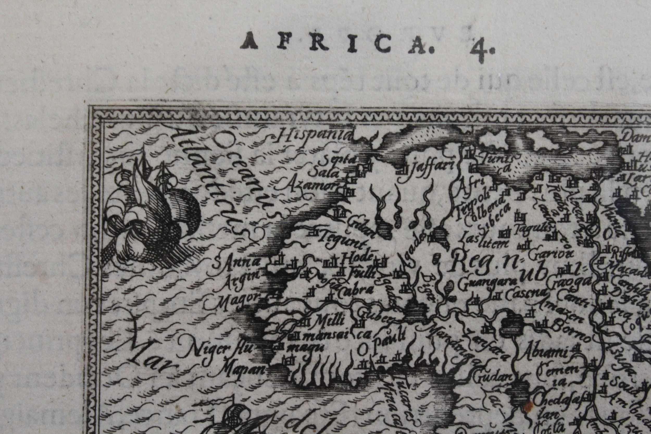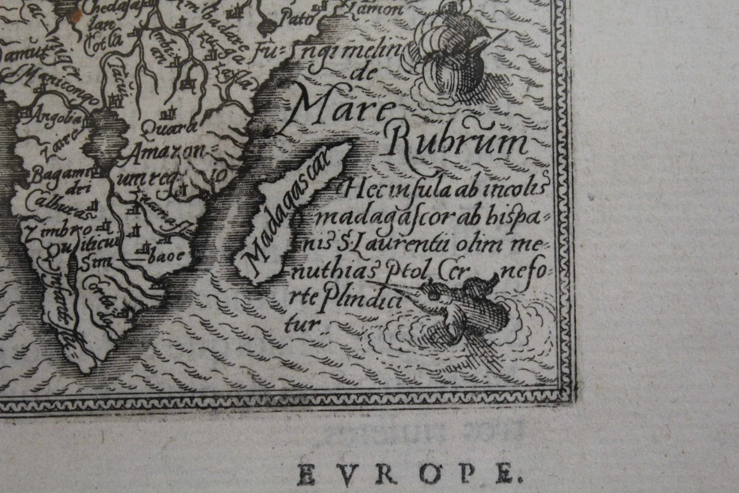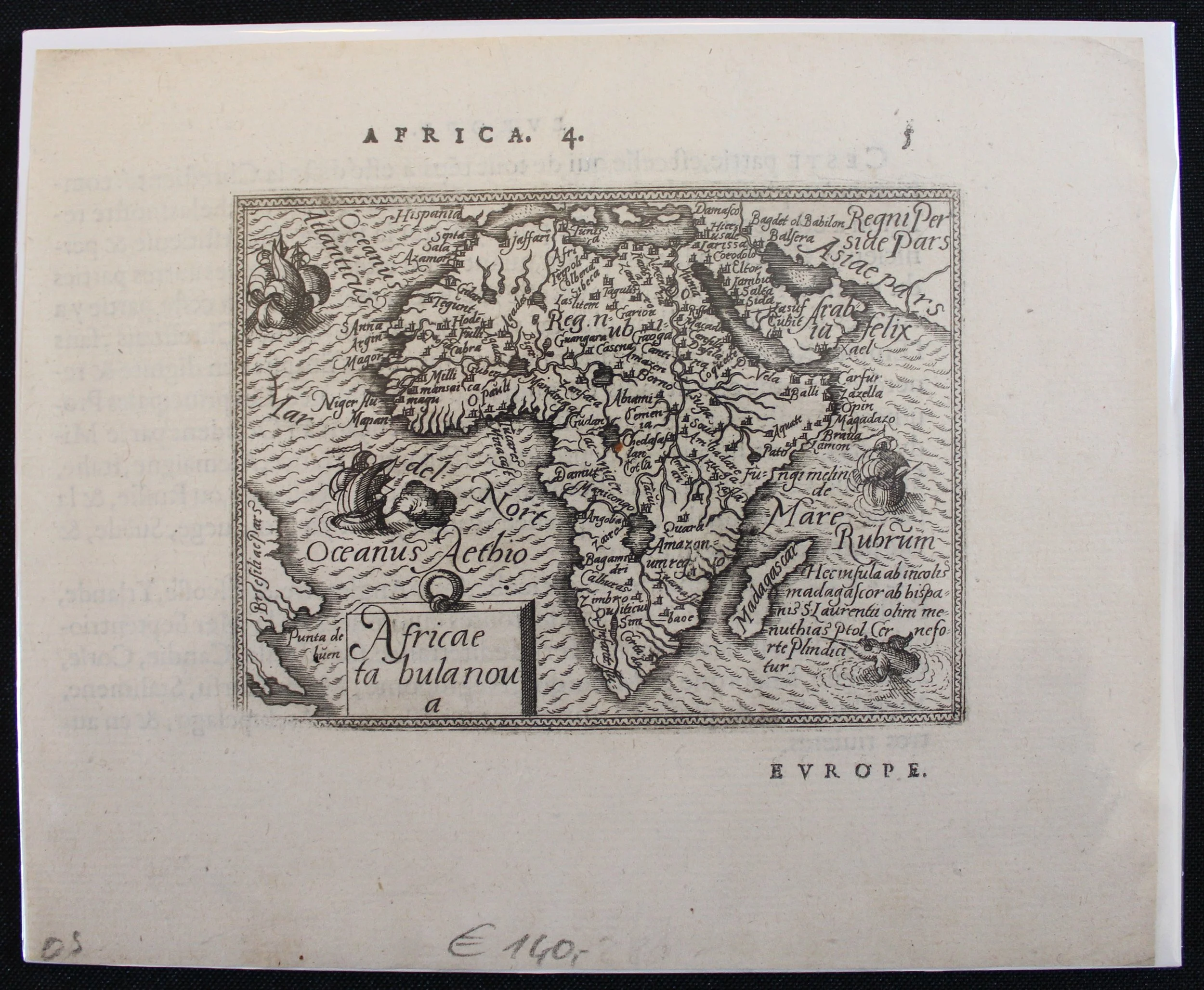 The map is decorated with three sailing ships, a sea monster, and fully engraved seas. The most notable change made from the folio map to its miniature version is the removal of Lake Zaflan, the smaller of the two Ptolemaic source lakes for the Nile River.