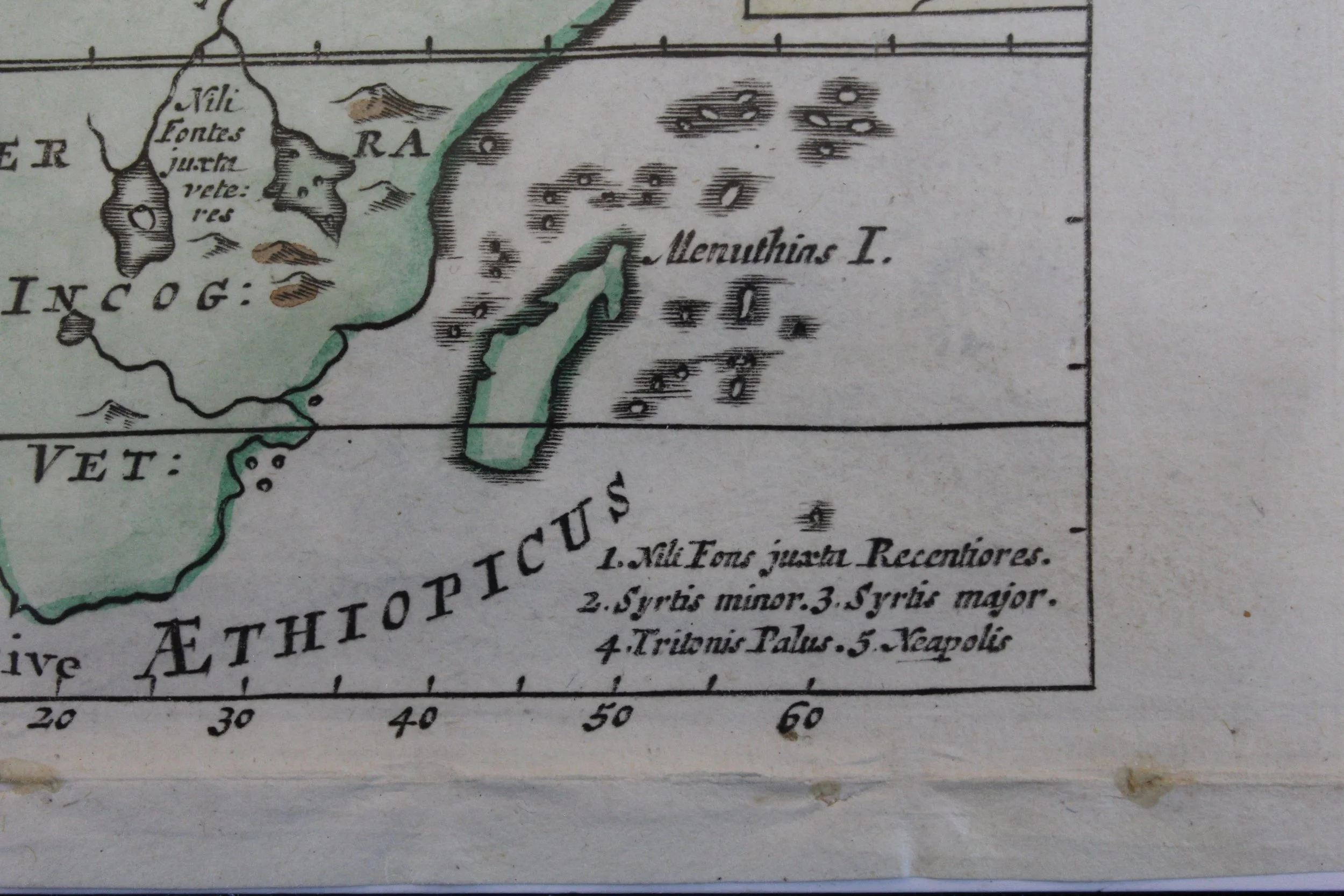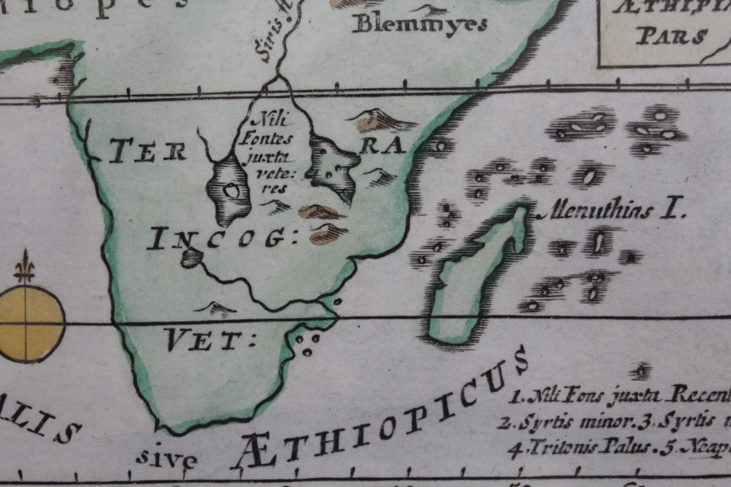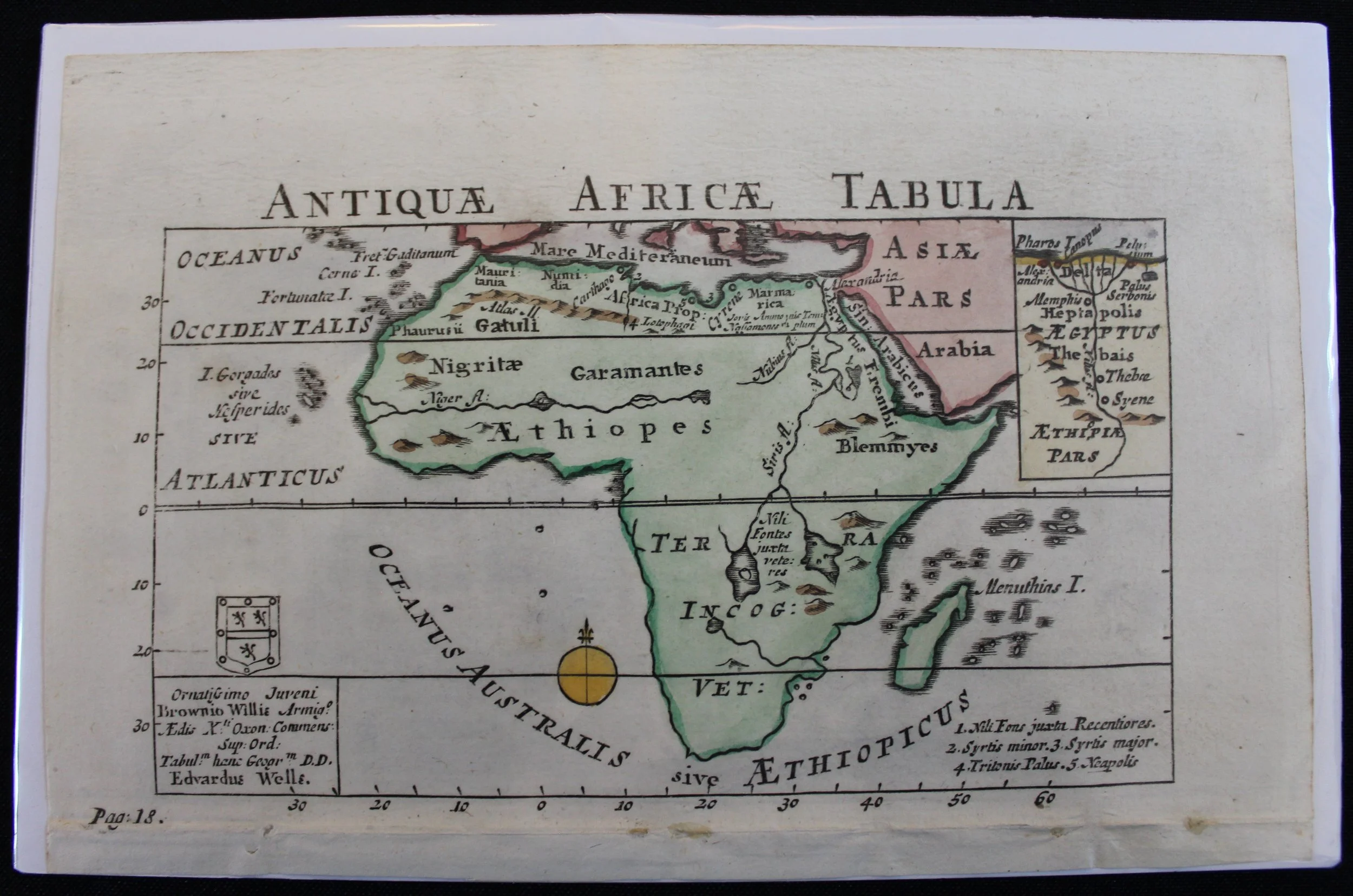 This uncommon map of Africa is a reduced version of Wells' larger map of Africa. From the popular school book "Tes palai kai tes nyn Oikoumenes Periegesis, sive Dionysii Geographia Emendata & Locupletata Additione scil. Geographiae Hodernae Græco Carmine pariter donatæ. Cum 16 tabulis geographicis. Ab Edv. Wells, A.M.", published by A. & J. Churchill in London circa 1704.