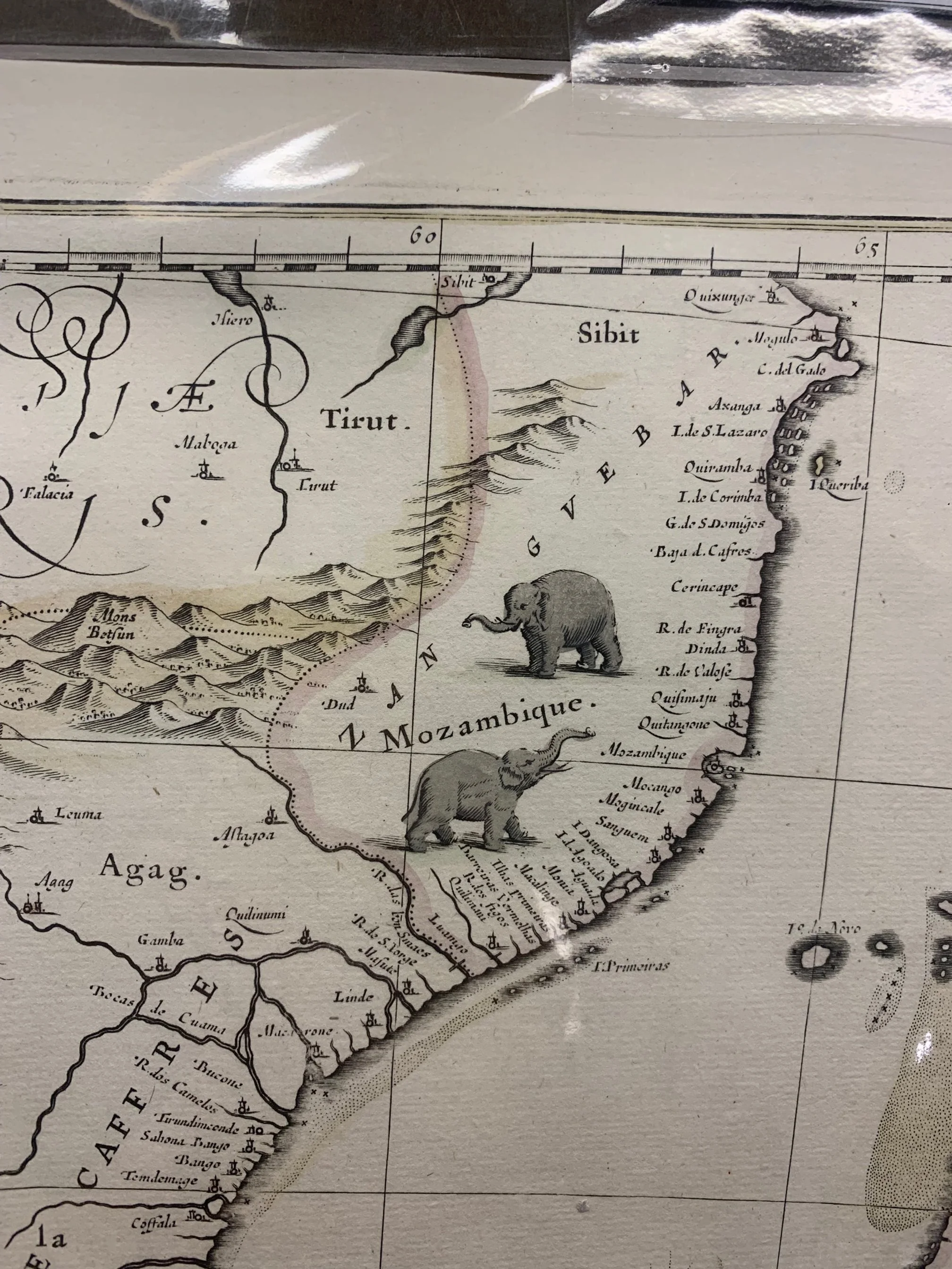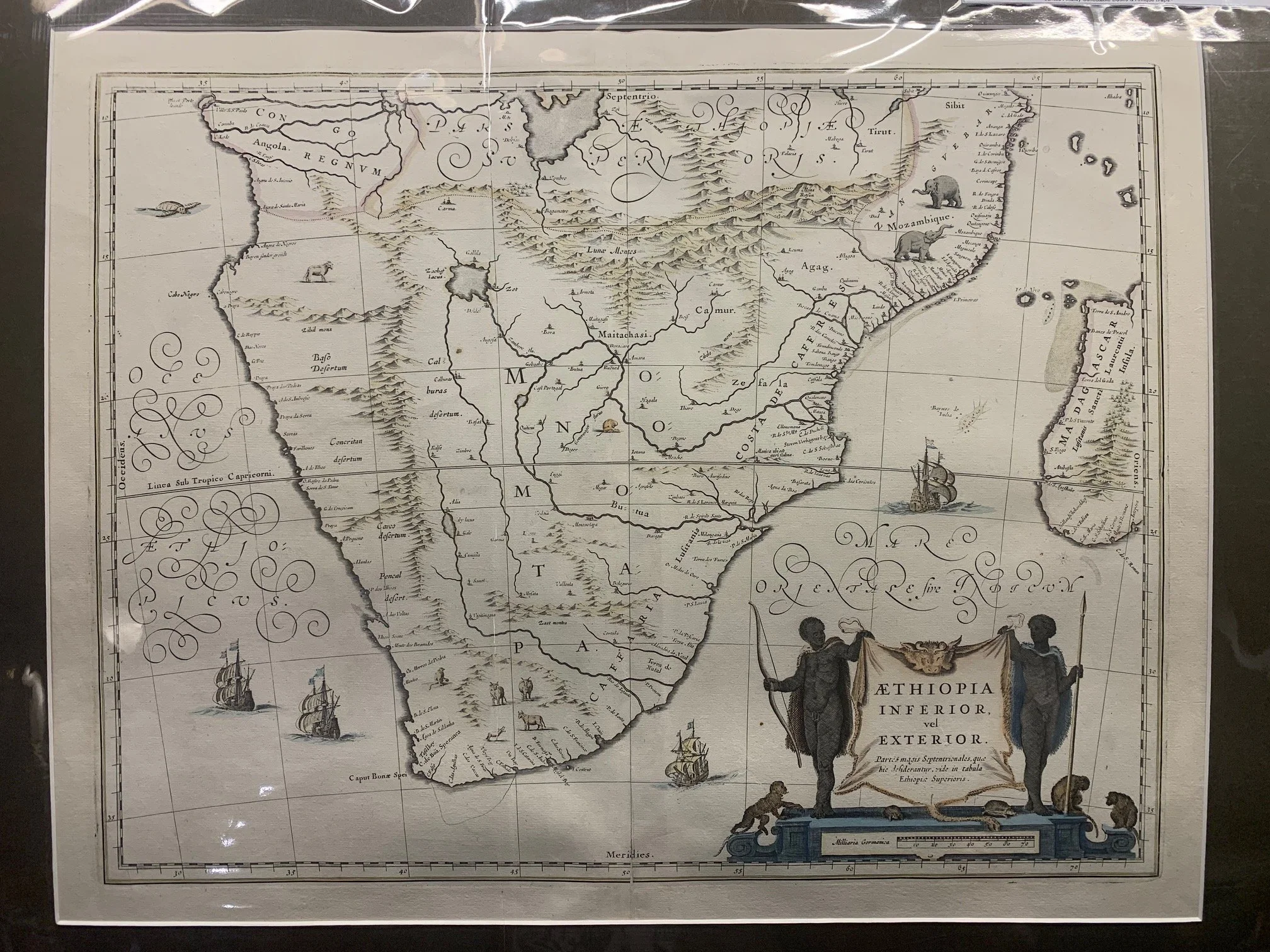 Africa is depicted with cities, buck and elephant. In the oceans can be seen sailing ship, and a turtle. The decorative cartouche features a scale in German miles on a neoclassical carved marble like base. On the top are three Colobus monkeys (East Africa), two tortoises, and two Africans holding up an animal skin. Also featured are Table Bay and the Cape of Good Hope (20 years prior to Jan van Riebeek’s’ settlement). Matthaus Merian copied this map and published it in 1638. See Norwich map 154.