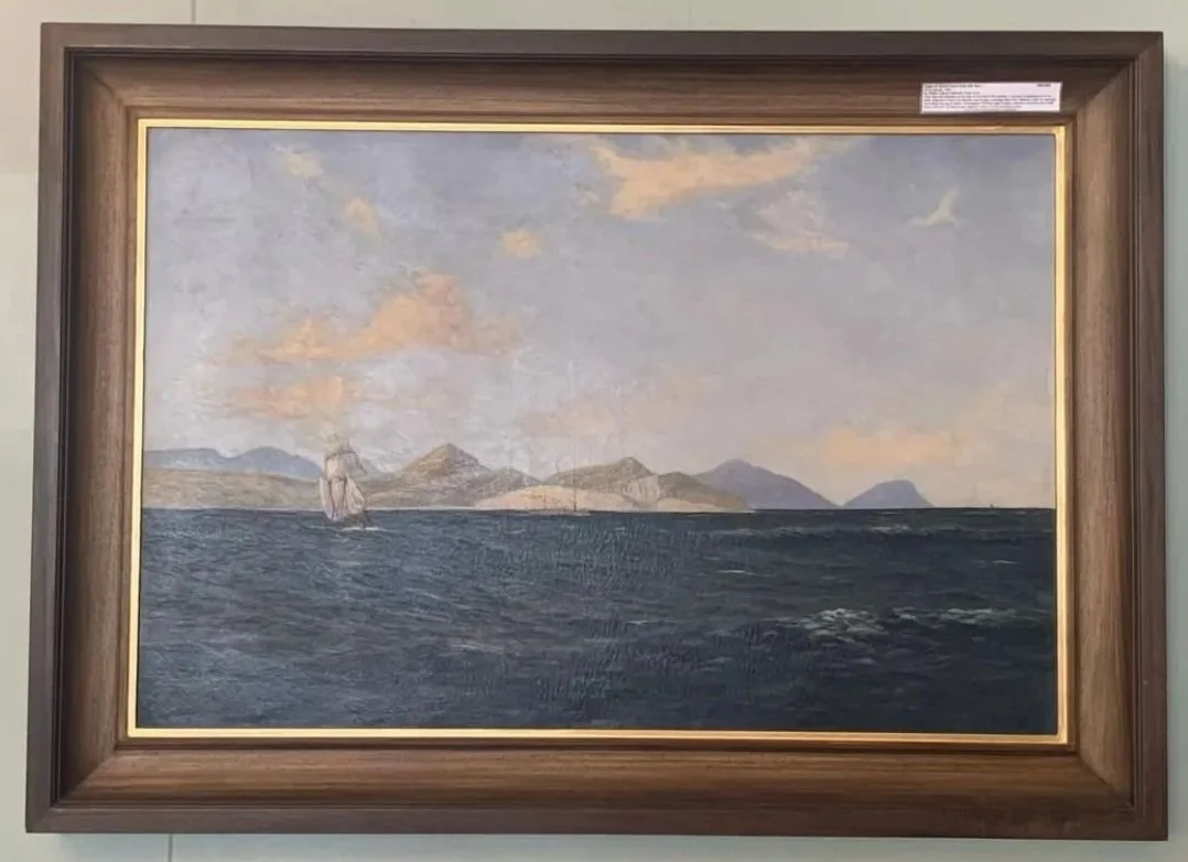 False Bay and Hangklip can be seen to the right of the painting. A schooner is beating out to sea while a Rennie's Direct Line Steamer can be seen rounding Cape Point. Methven might be making a point about the age of steam.