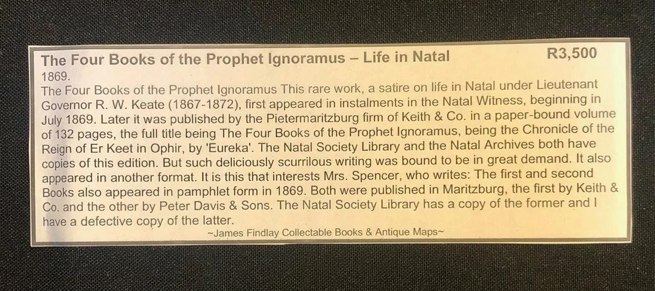 This rare work, a satire on life in Natal under Lieutenant Governor R. W. Keate (1867-1872), first appeared in instalments in the Natal Witness, beginning in July 1869. Later it was published by the Pietermaritzburg firm of Keith & Co. in a paper-bound volume of 132 pages, the full title being The Four Books of the Prophet Ignoramus, being the Chronicle of the Reign of Er Keet in Ophir, by 'Eureka'.