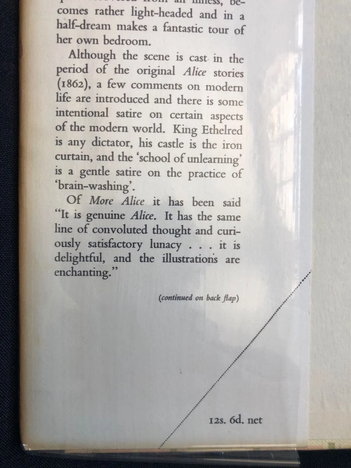 Of More Alice it has been said "It is genuine Alice. It has the same line of convoluted thought and curiously satisfactory lunacy...it is delightful, and the illustrations are enchanting."(https://www.goodreads.com/book/show/3052594-more-alice)
