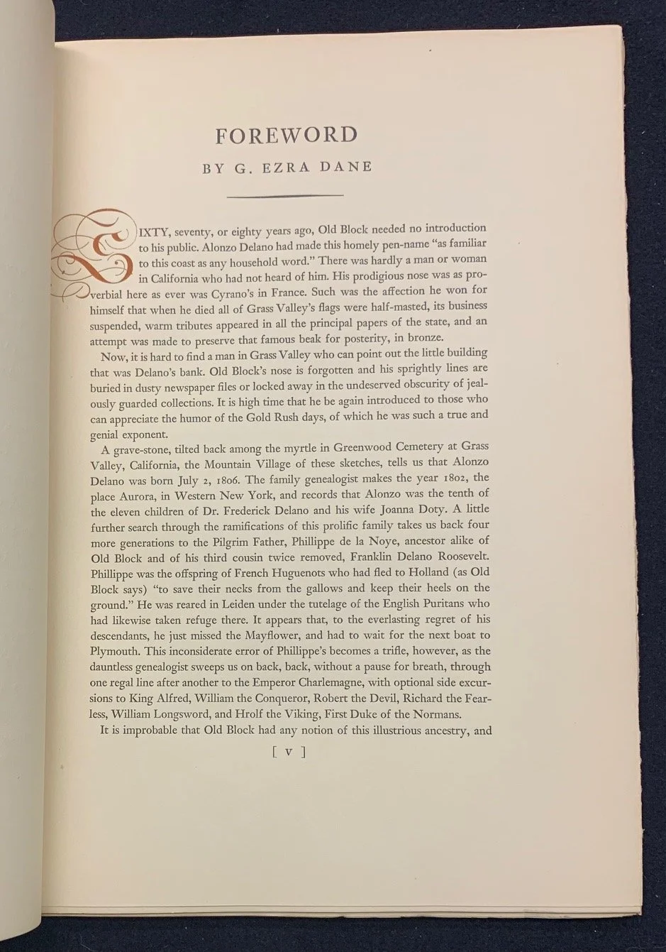 Alonzo Delano (1806 - 1874), who went by the pen name "Old Block", was an American humorist, pioneer town city father, and a California Gold Rush Forty-niner. Delano's sketches of gold rush camp life rivaled Bret Harte and Mark Twain in popularity.