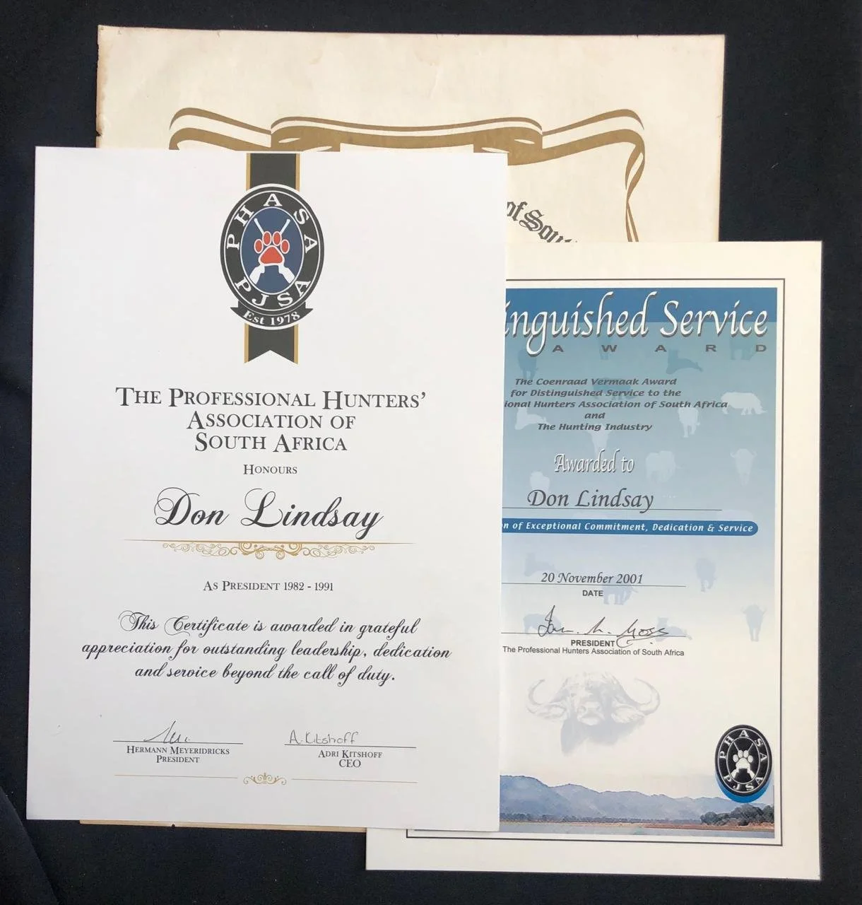 Don Lindsay was a founding member of the Professional Hunters’ Association of South Africa (PHASA) and served PHASA almost a decade as president. He exhibited the profoundest belief that sustainable and regulated hunting was an important conservation tool in Africa. He was also one of the founding members and long-time president of the International Professional Hunters’ Association (IPHA) as well as an important contributor of expertise and knowledge and founding director of Conservation Force, contributing to initiatives such as the Bontebok and the Black-faced Impala. Apart from his membership in professional associations he was a member of Shikar-Safari Club International, Safari Club International and numerous other hunting associations.