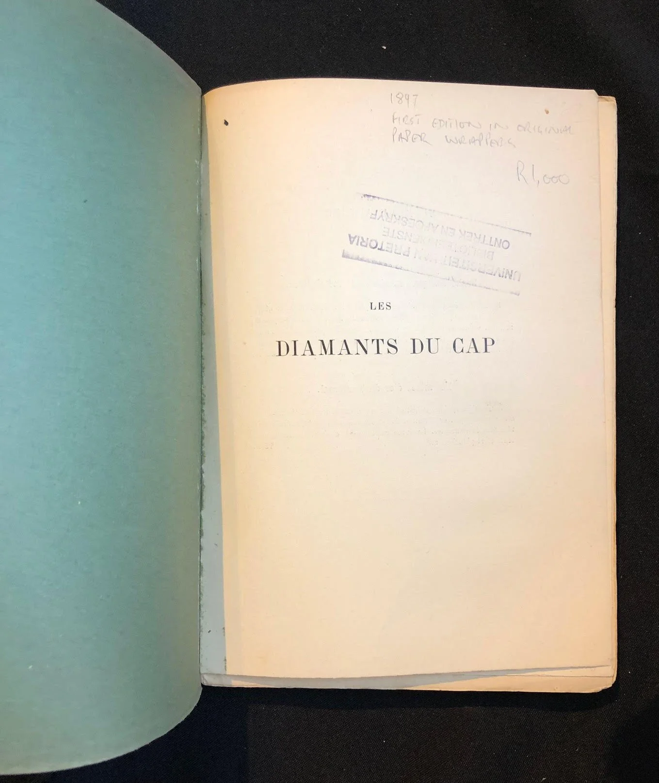Les Diamants du Cap Published in 1897.First edition in original paper wrappers; includes fold-out map.160 x 230mmR1,000 Enquire Now Slide 1 Slide 1 (current slide) Slide 2 Slide 2 (current slide) Slide 3 Slide 3 (current slide) Slide 4 Slide 4 (current slide) Slide 5 Slide 5 (current slide)