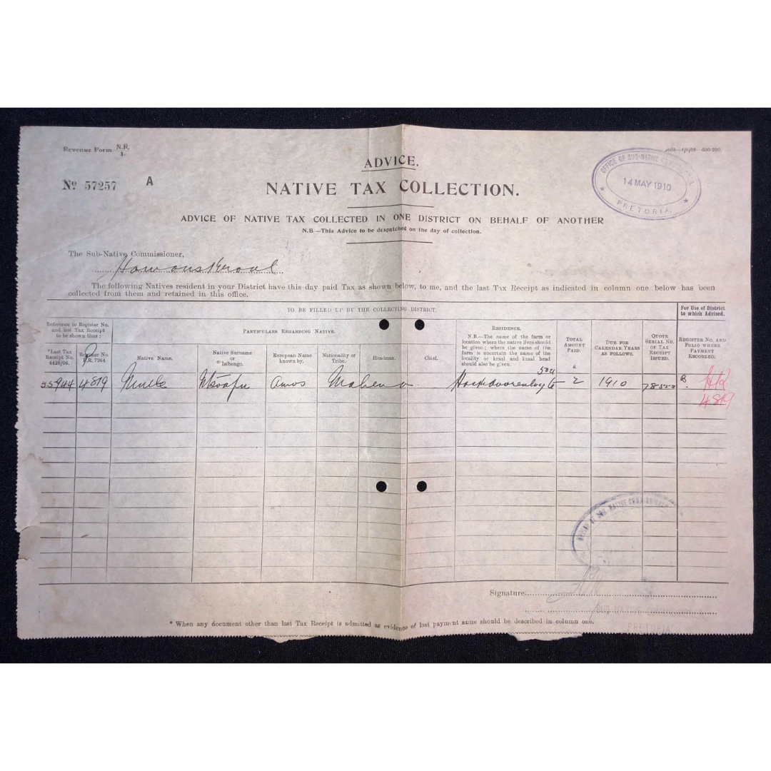 Inland Revenue 'Native Tax Receipt' 1910 R1,000