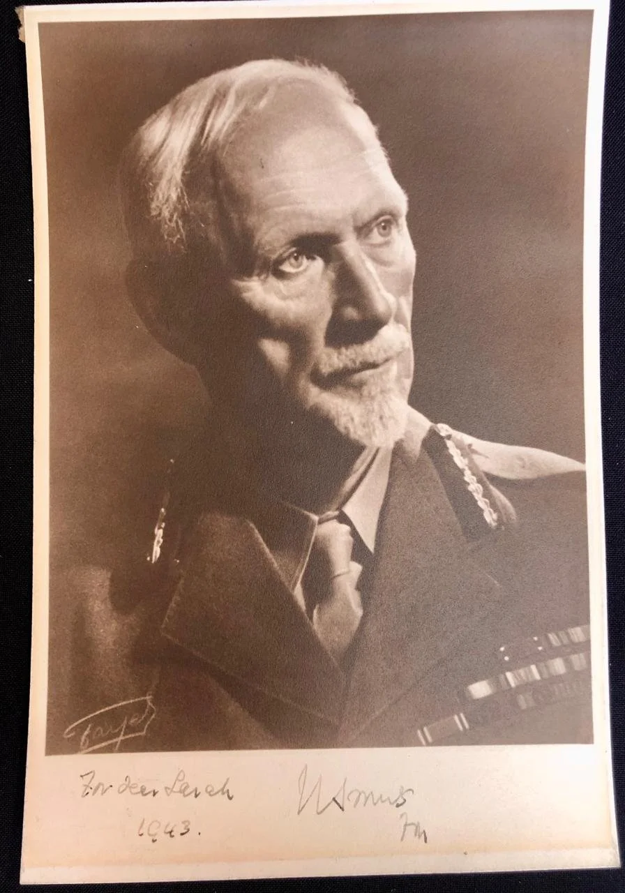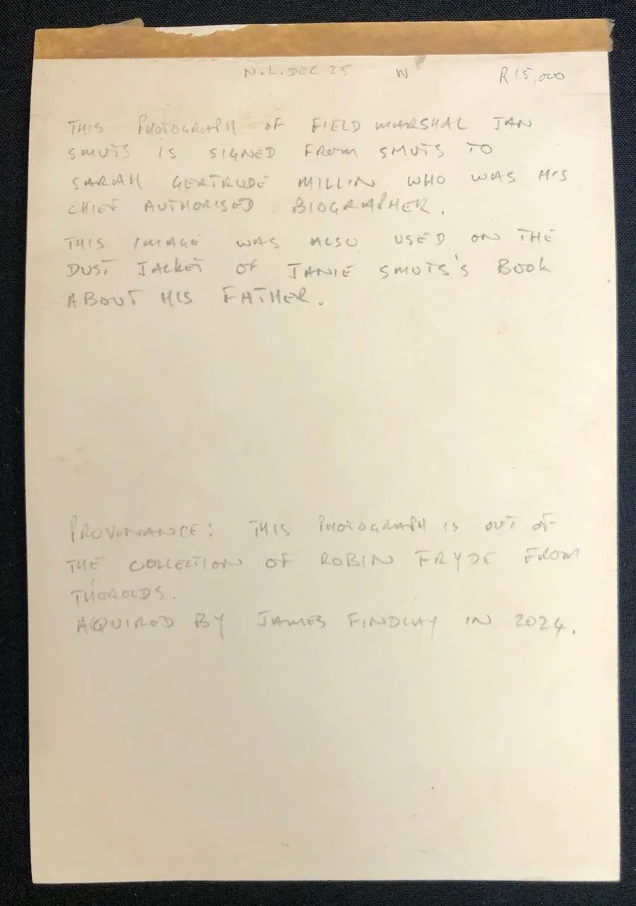 Original photograph of Jan Smuts in his Field Marshall's uniform, dated 1943 at a time when he was based in the UK as a serving F.M. The inscription is dedicated to Sarah Gertrude Millin.