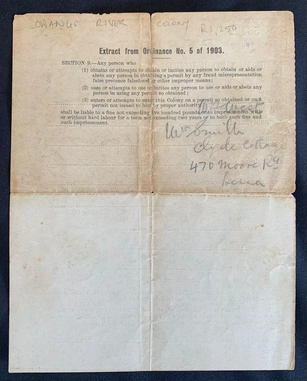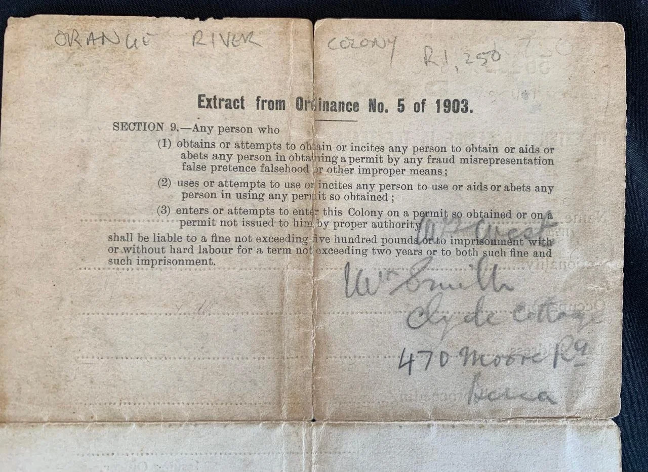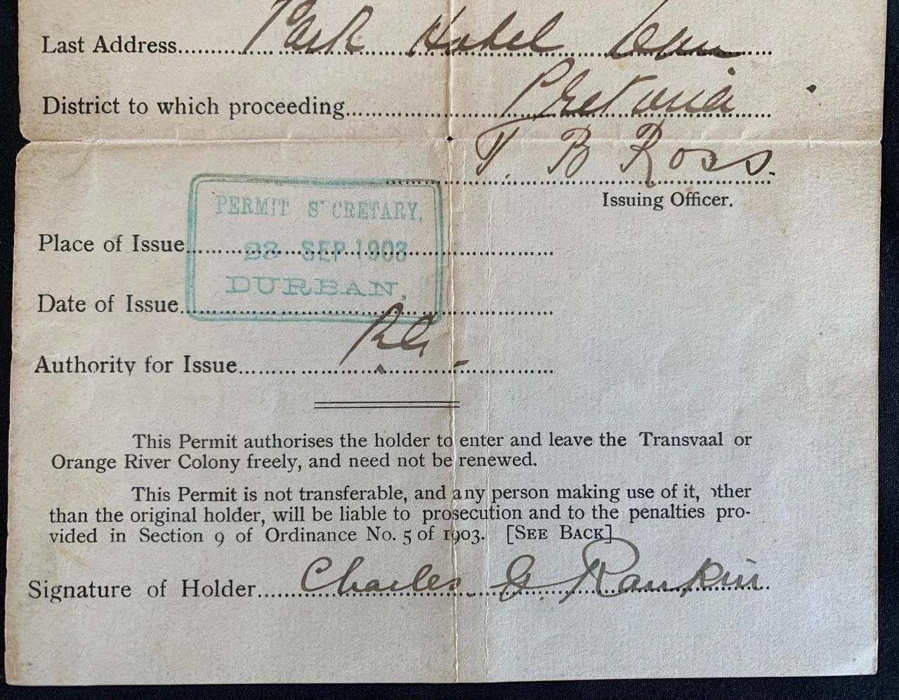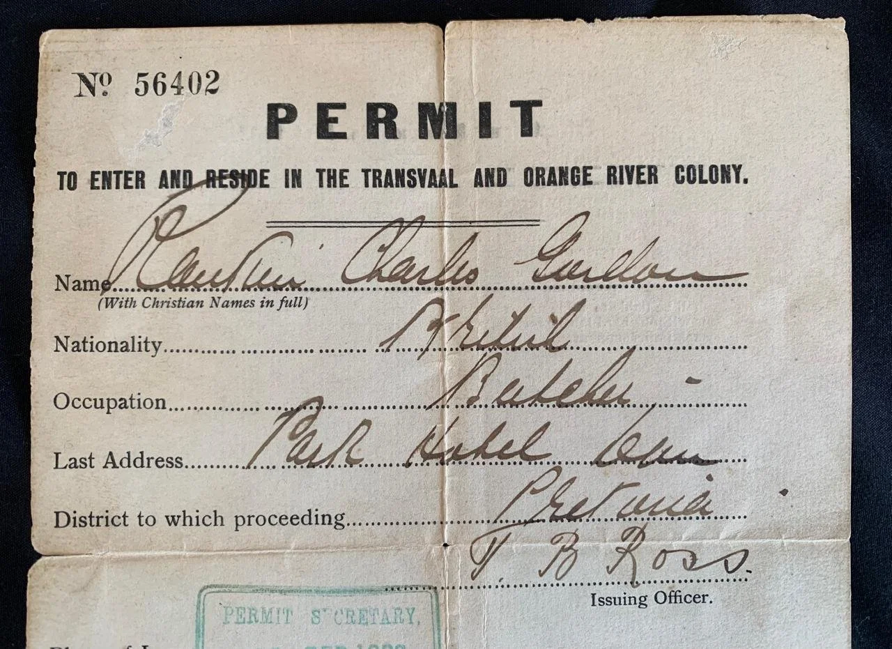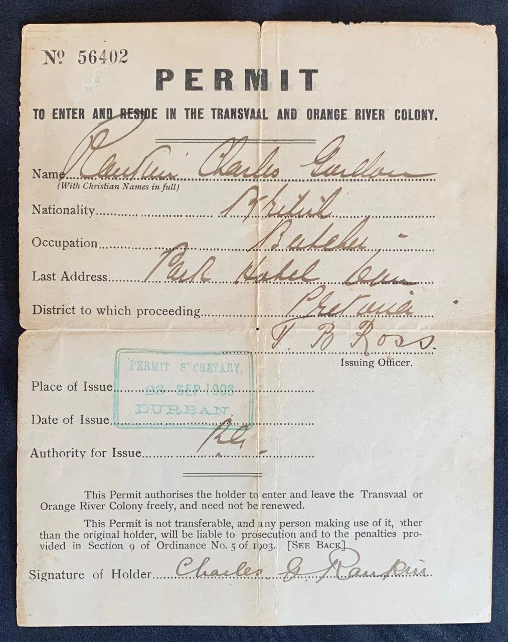 Permit to Enter and Reside in the Transvaal and Orange River Colony 1903 Issued in Durban, 23 September 1903.160mm x 198mmR1,250 Enquire Now Slide 1 Slide 1 (current slide) Slide 2 Slide 2 (current slide) Slide 3 Slide 3 (current slide) Slide 4 Slide 4 (current slide) Slide 5 Slide 5 (current slide)