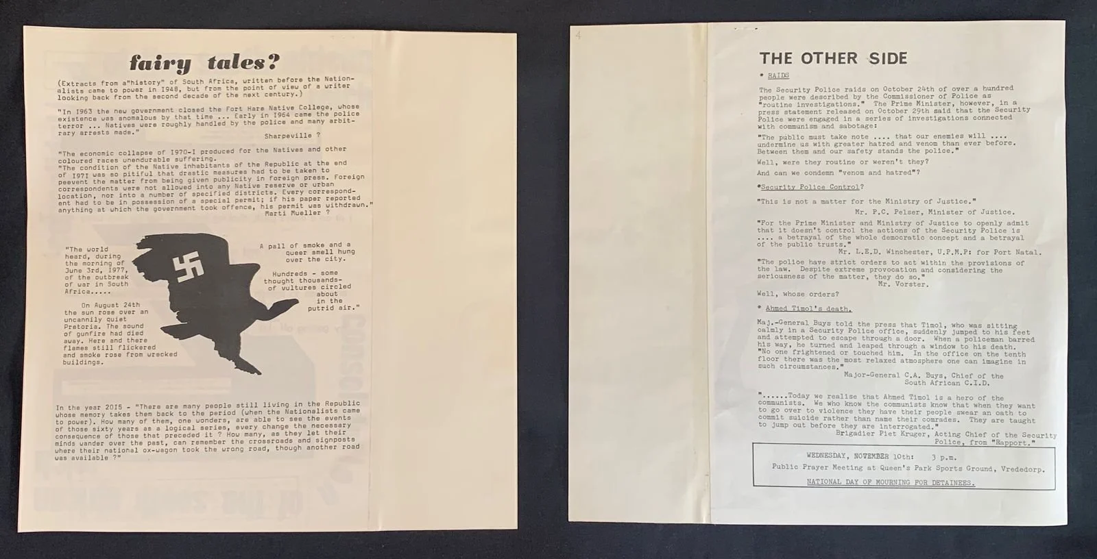 In 2017, the inquest into Timol's death was reopened. It found that Timol had been tortured in custody and had fallen from the window because he was pushed by police officers, not because he jumped.