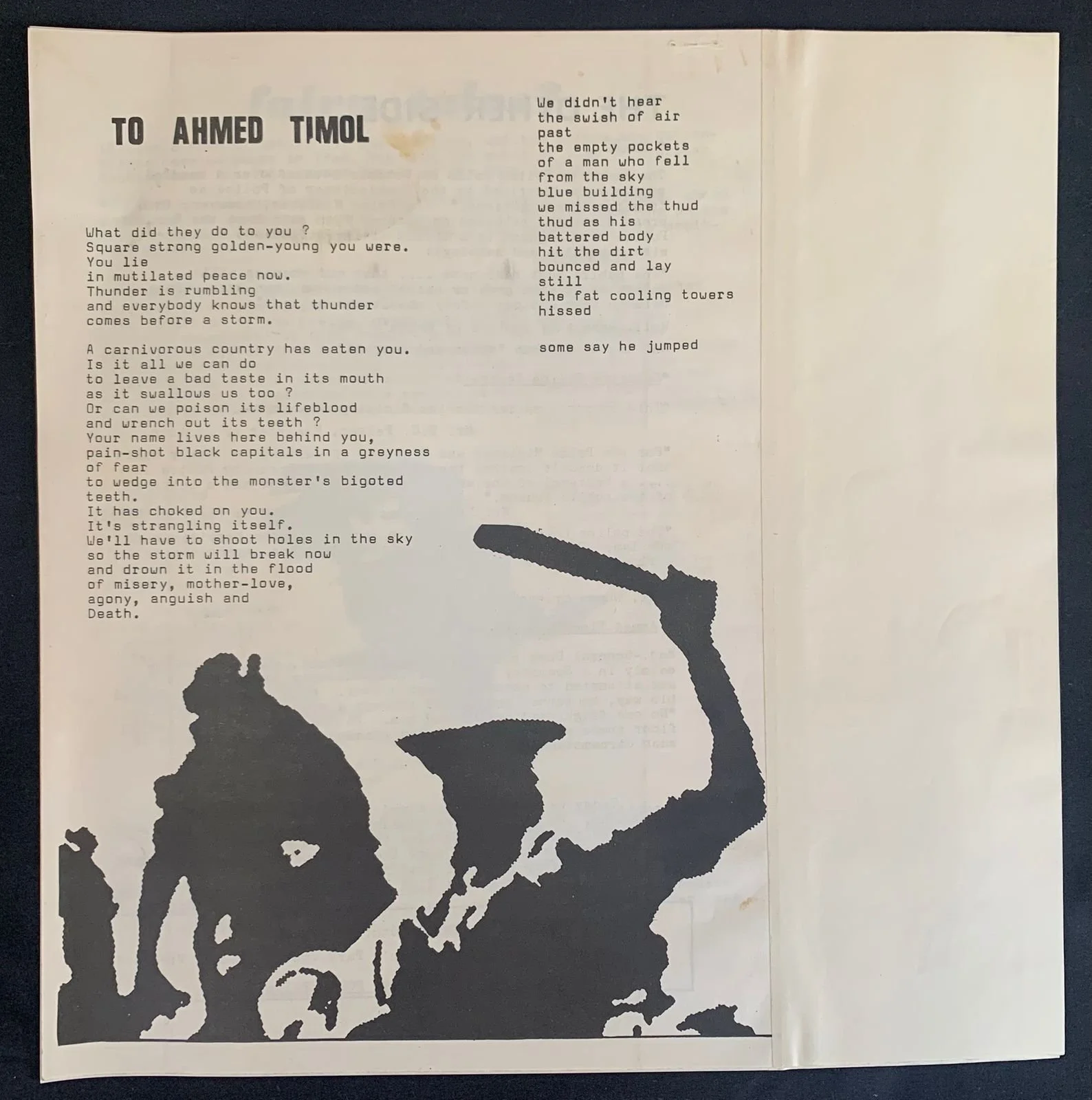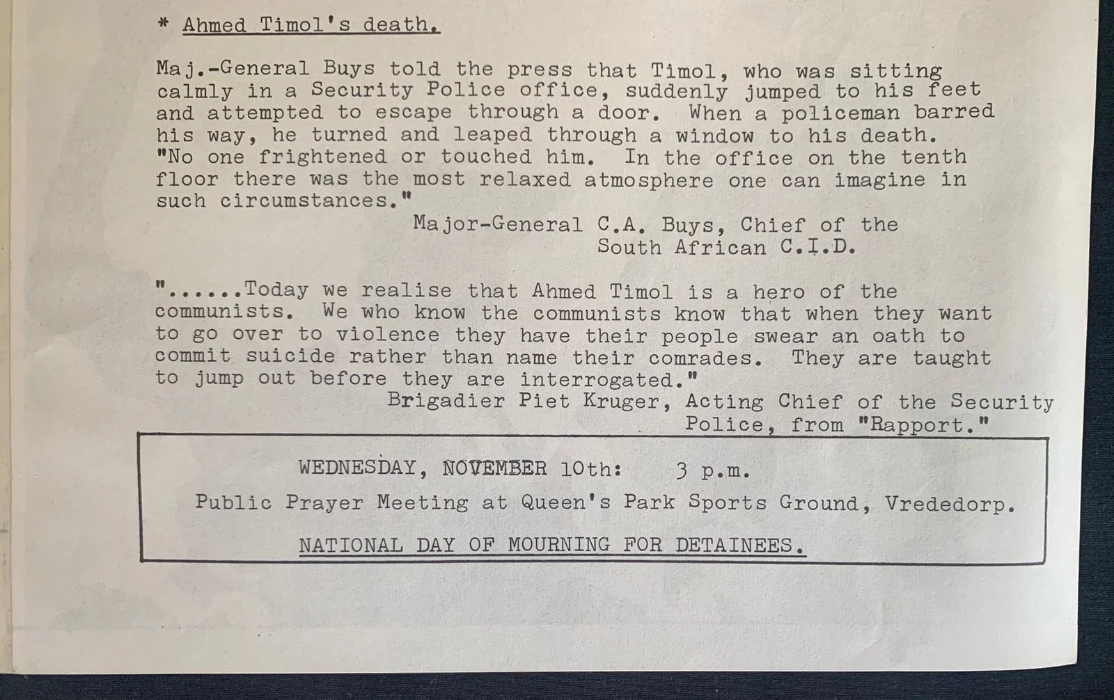 Ahmed Timol (3 November 1941 – 27 October 1971) was an anti-apartheid activist in the underground South African Communist Party. He died at the age of 29 from injuries sustained when he fell from the top floor of John Vorster Square police station in Johannesburg. Police claimed, and an official inquest confirmed, that Timol had committed suicide by jumping out the window. The claim was widely disbelieved in anti-apartheid circles, and in the movement Timol's death became symbolic of the broader phenomenon of deaths in police custody, as well as of the abuses and dishonesty of the apartheid state.
