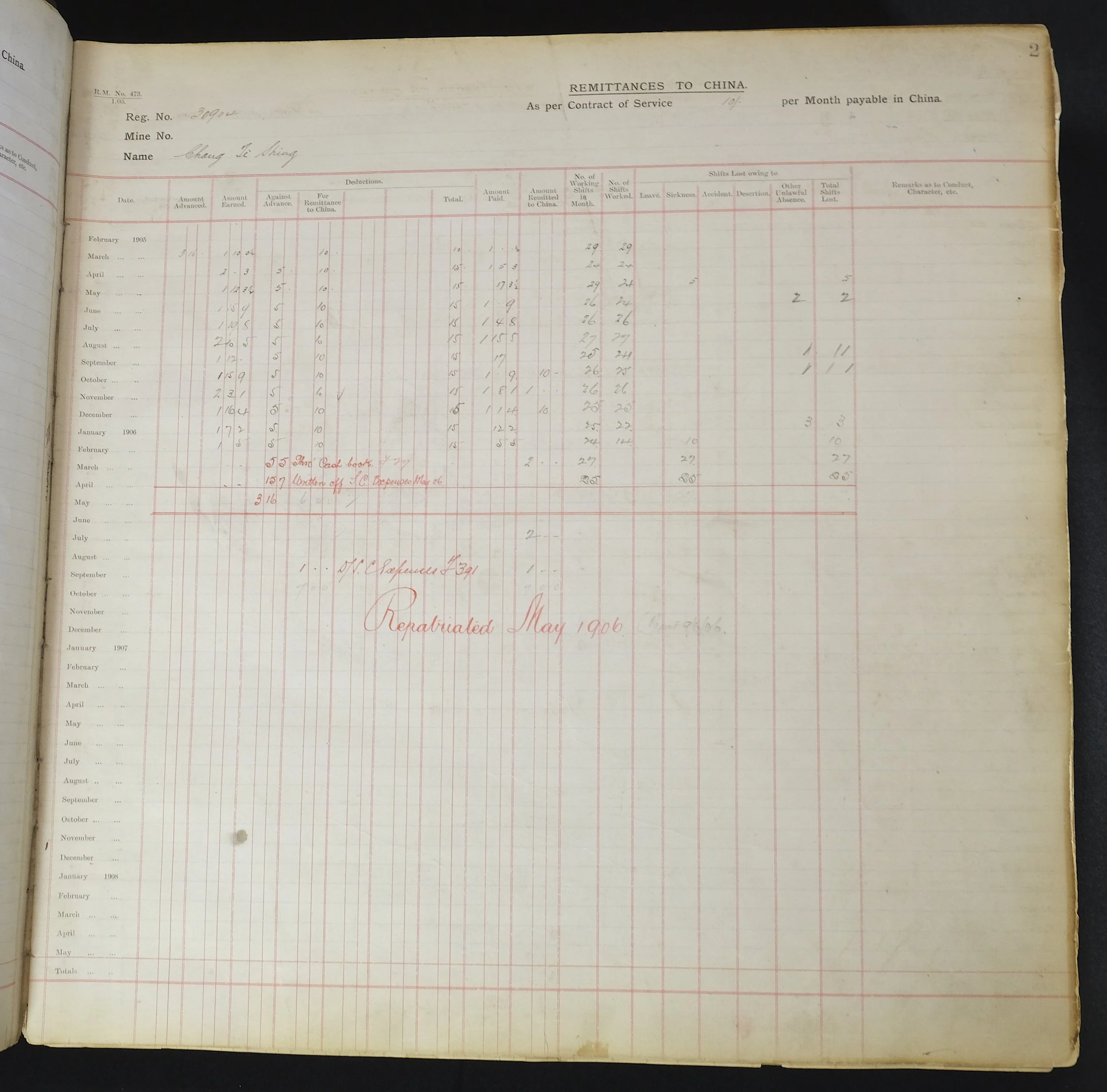 Remittances to China ledger. This ledger is an extremely unusual reference. The indentured Chinese labour after the Boer War c. 1904-1909. This ledger has specific reference to the city of Johannesburg. The remittances to China mentioned here would have been paid to the Chinese engineering & mining corporation.