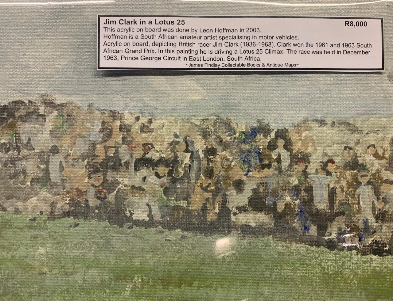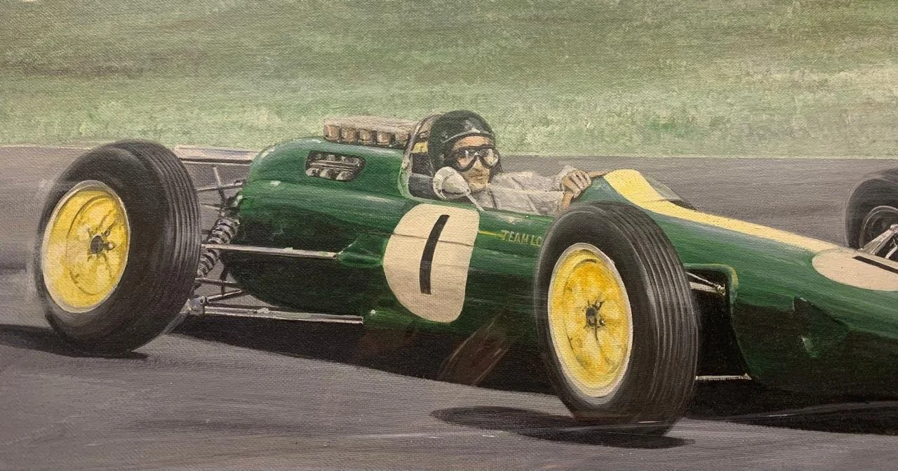 Acrylic on board, depicting British racer Jim Clark (4 March 1936 – 7 April 1968) a British racing driver from Scotland, who competed in Formula One from 1960 to 1968. Clark won two Formula One World Drivers' Championship titles with Lotus, and—at the time of his death—held the records for most wins (25), pole positions (33), and fastest laps (28), among others. In American open-wheel racing, Clark won the Indianapolis 500 in 1965 with Lotus, becoming the first non-American winner of the race in 49 years.