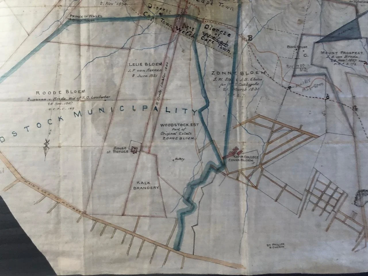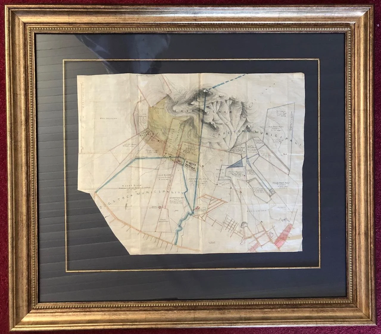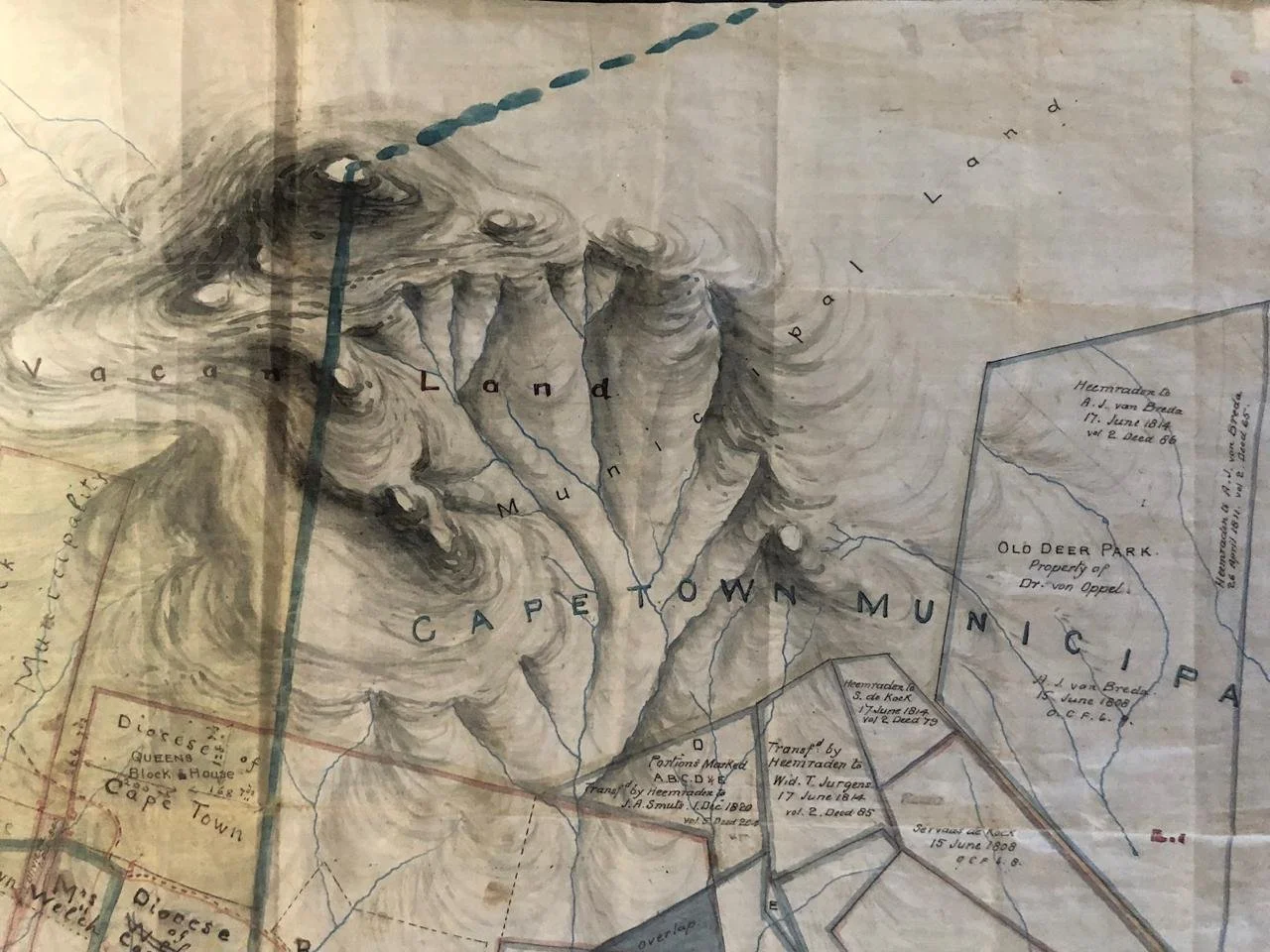 Provenance: Peter Spronk was a Land Surveyor and had a practice in Hermanus for 35 years. He found this map in a box when he moved premises. Spronk explains: ‘How a Cape Town plan was found there is anyone’s guess. It could have been that a land surveyor from Cape Town worked with the then local land surveyor. It happens often, even up to today.